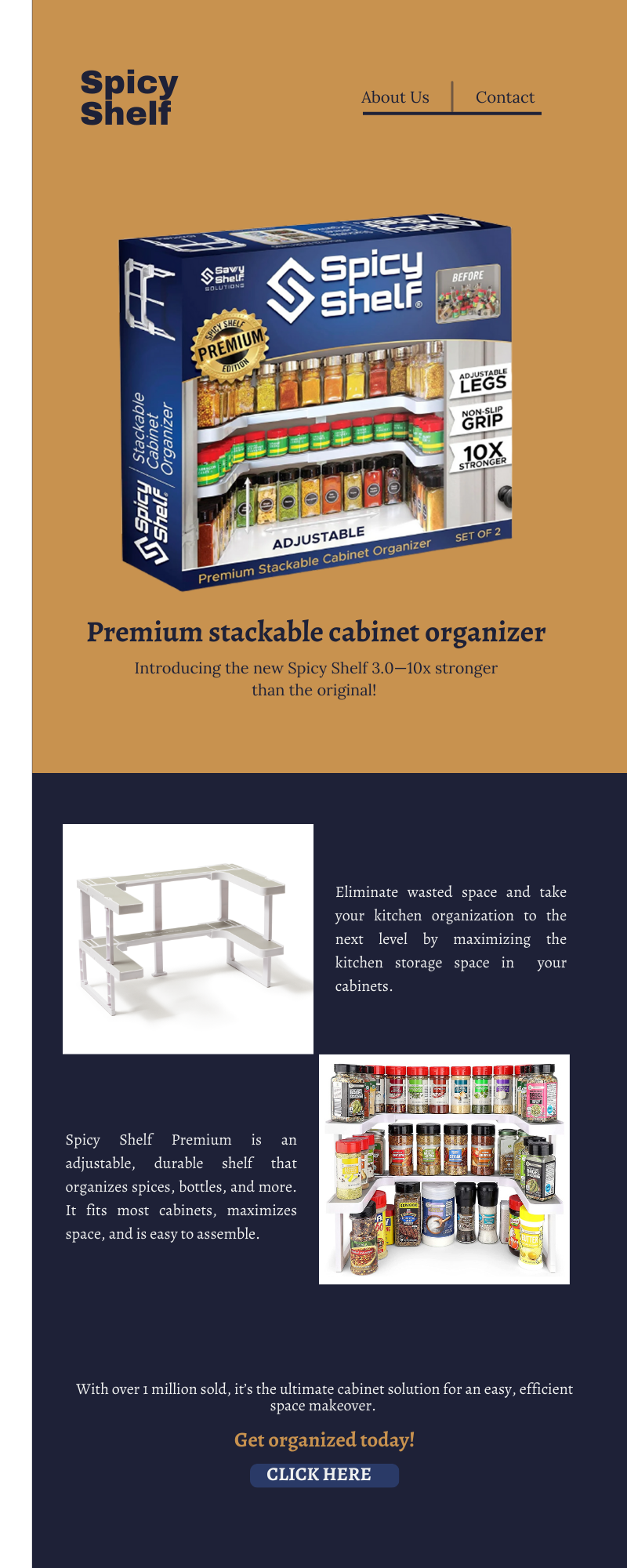 Spicy Shelf Premium is an adjustable, durable shelf that organizes spices, bottles, and more. It fits most cabinets, maximizes space, and is easy to assemble.